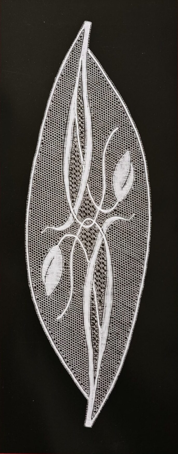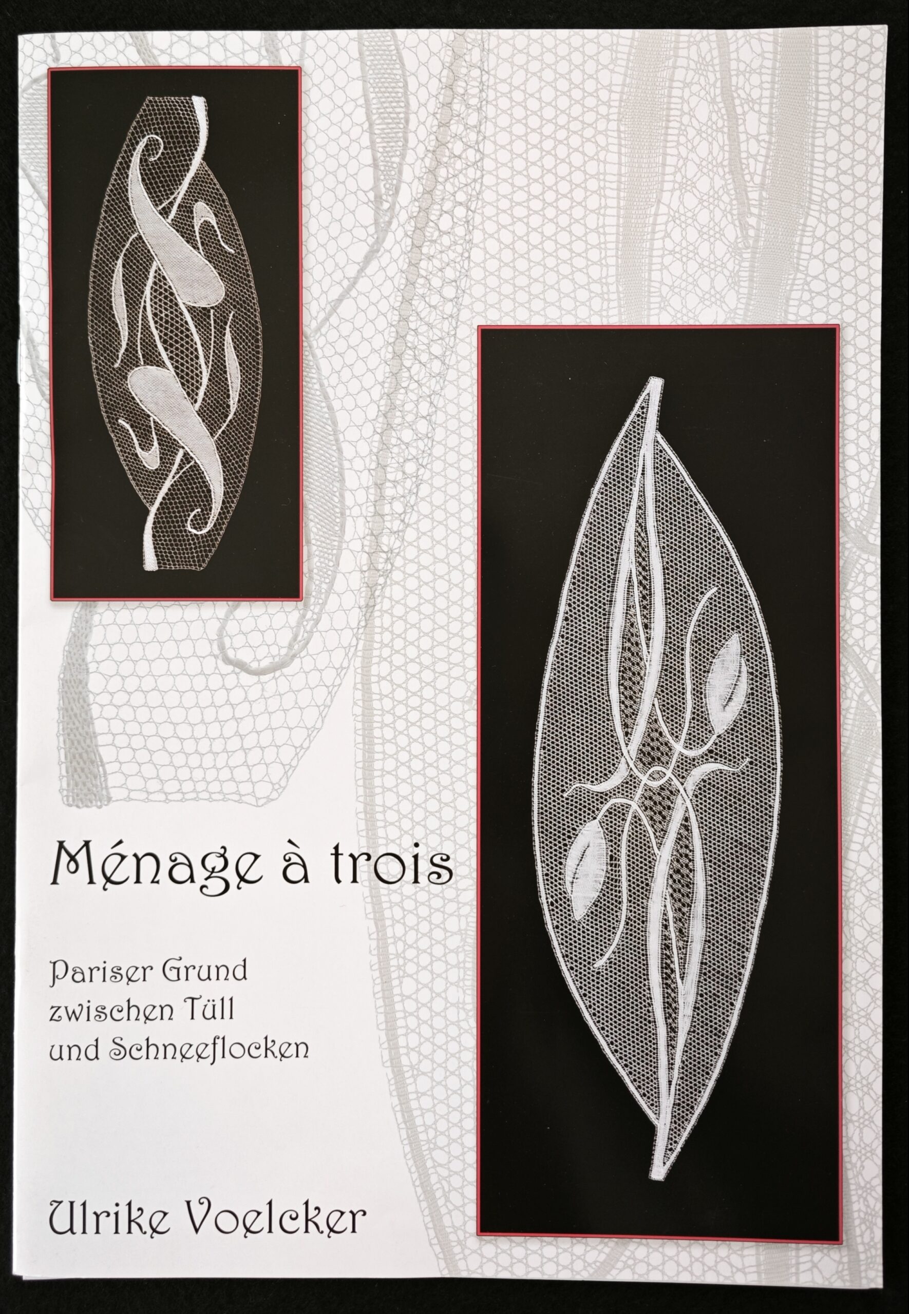 El encaje de París se distingue por su fondo hexagonal cortado por un hilo horizontal formando mallas triangulares. Los motivos estan rodeados de un reseguido y se componen habitualmente de flores, hojas, rosas tréboles que destacan sobre una red adornada con pequeñas bolas. Tambien podemos destacar la delicadeza, la finura de sus hilos y la armonía de sus patrones ornamentales, y su fondo específico realizado con 3 pares en cada cruce. Tradicionalmente se caracteriza por motivos florales, hojas estilizadas, pequeñas redes y elementos geométricos que se combinan para formar composiciones equilibradas y ligeras. En este trabajo, Ulrike Voelcker trabaja diseños modernos de su creación utilizando esta técnica tan poco trabajada por las encajeras.